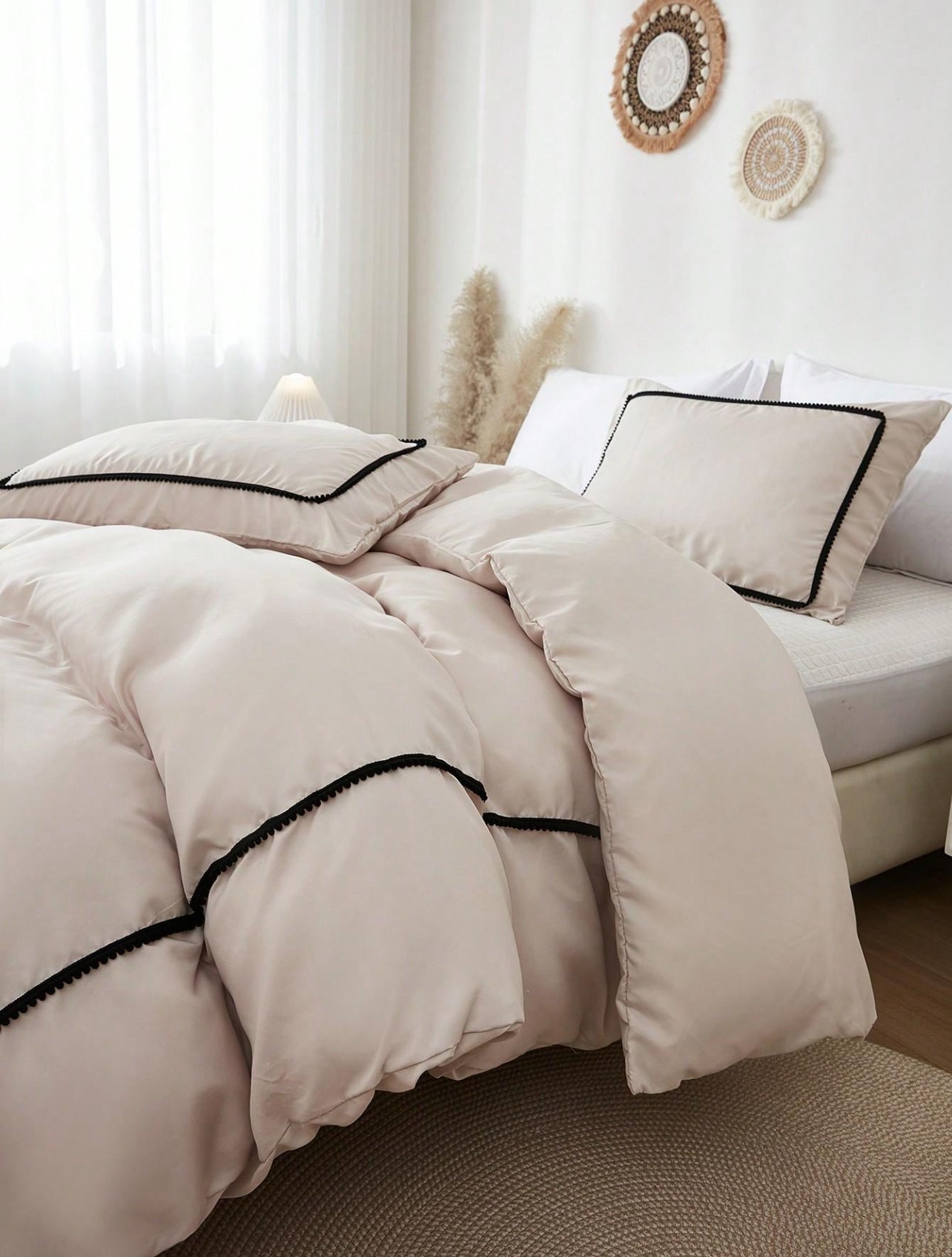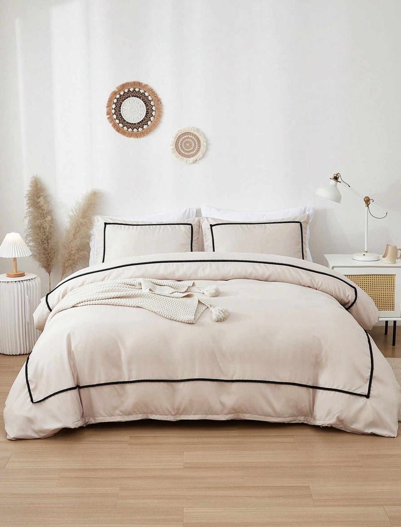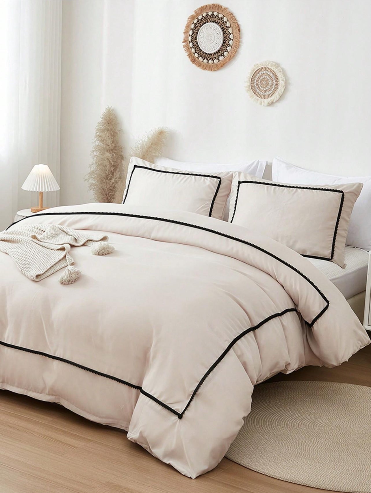 Sencillo, elegante y atemporal, el Edredón Marco combina un suave tono beige con un ribete negro que enmarca el diseño, aportando un contraste sutil y sofisticado. Ideal para quienes valoran la estética minimalista y la armonía visual, este set transforma la cama en el centro de atención del dormitorio sin necesidad de recargar el espacio.