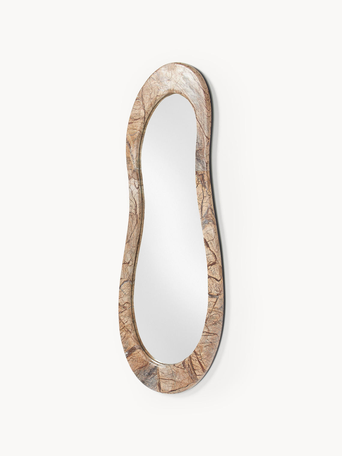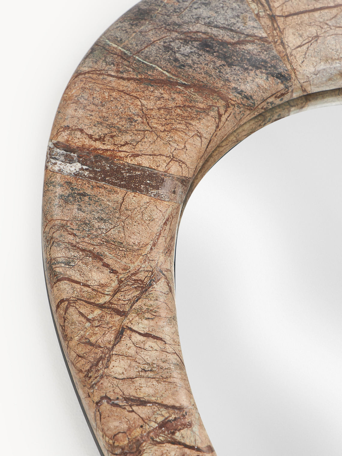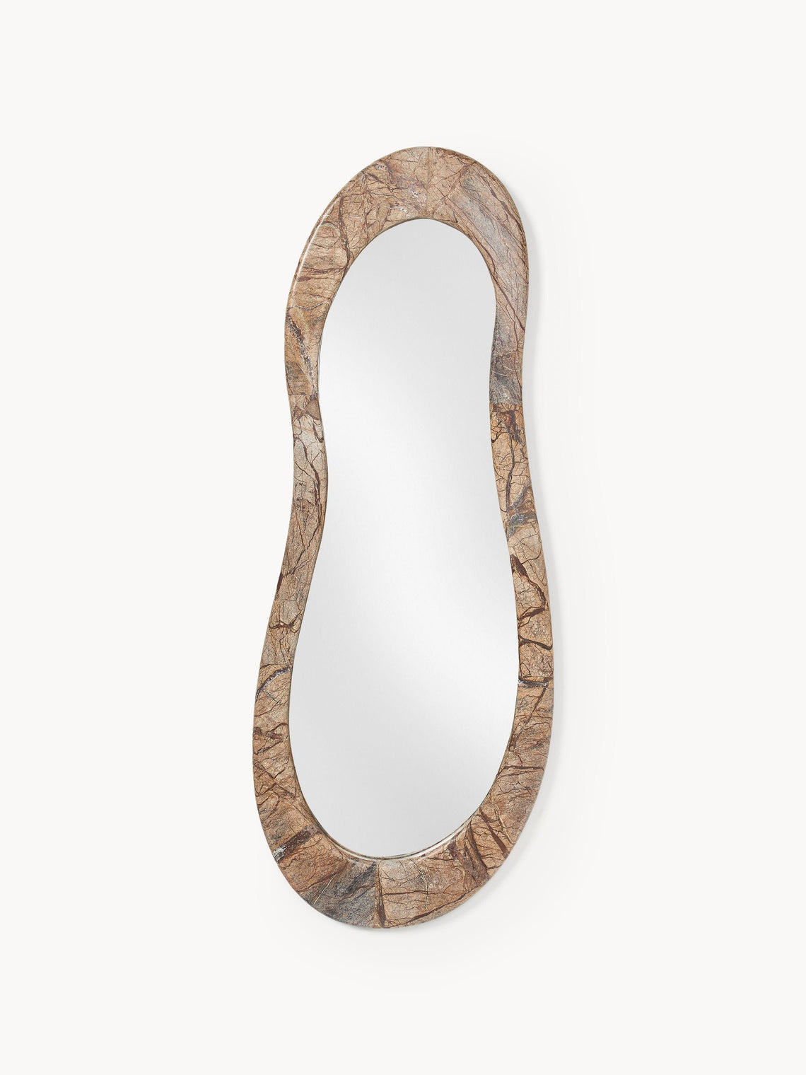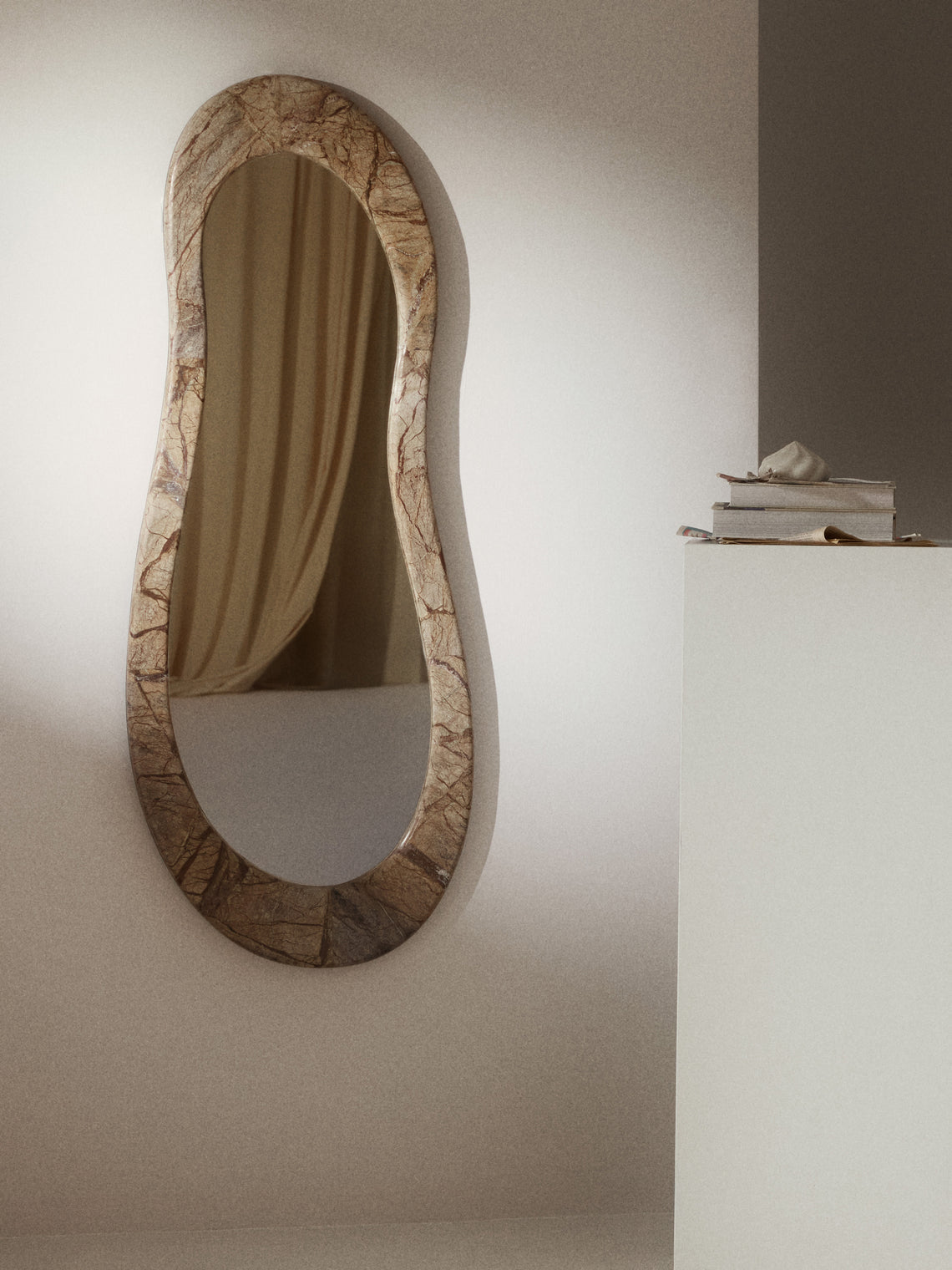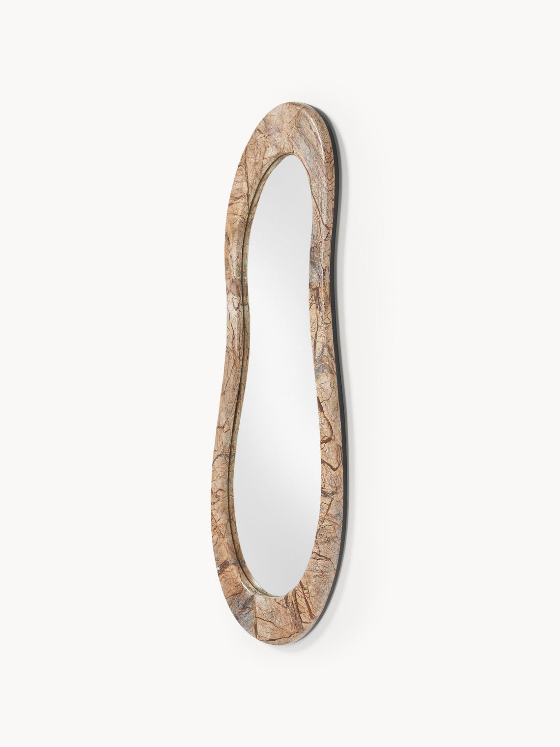 El Espejo Mármol destaca por su silueta orgánica e irregular que lo convierte en una pieza única y artística. Su marco, elaborado en mármol natural con vetas en tonos tierra, aporta textura, carácter y sofisticación a cualquier pared. Ideal como punto focal en recibidores, salas o dormitorios, combina diseño contemporáneo con la nobleza de la piedra natural.
